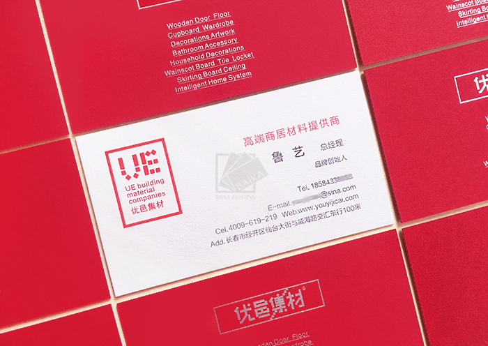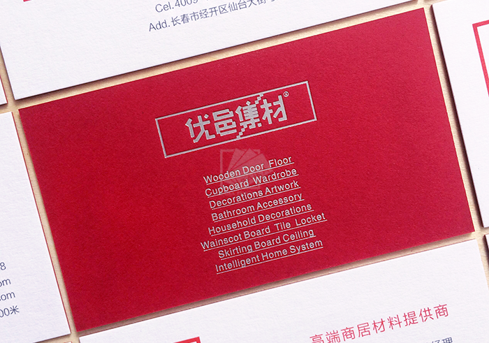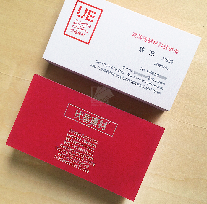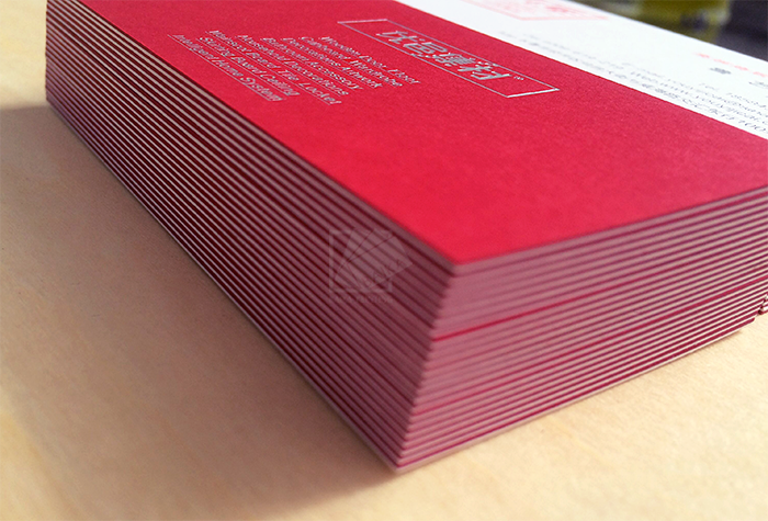 350G云素+350紅卡 雙層卡+印刷+燙亞銀 紅白雙層卡,使名片顏色不單調。 紅色特種紙燙亞銀,紙張質感完美呈現,提升名片品位; 紅色代表吉祥,喻意公司蓬勃發展。